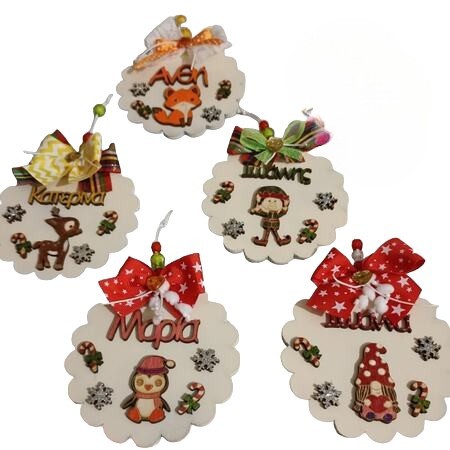 Ξύλινα στολίδια εξ ολοκλήρου χειροποίητα διακοσμημένα με διάφορα χριστουγεννιάτικα στοιχεία, με κορδέλες και χάντρες.