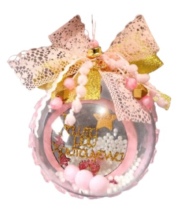 Ακρυλική διαφανής μπάλα διακοσμημένη εσωτερικά με ξύλινο στοιχείο με χαραγμένη τη φράση "Τα πρώτα μου Χριστούγεννα", πον πον και χιονάκι.