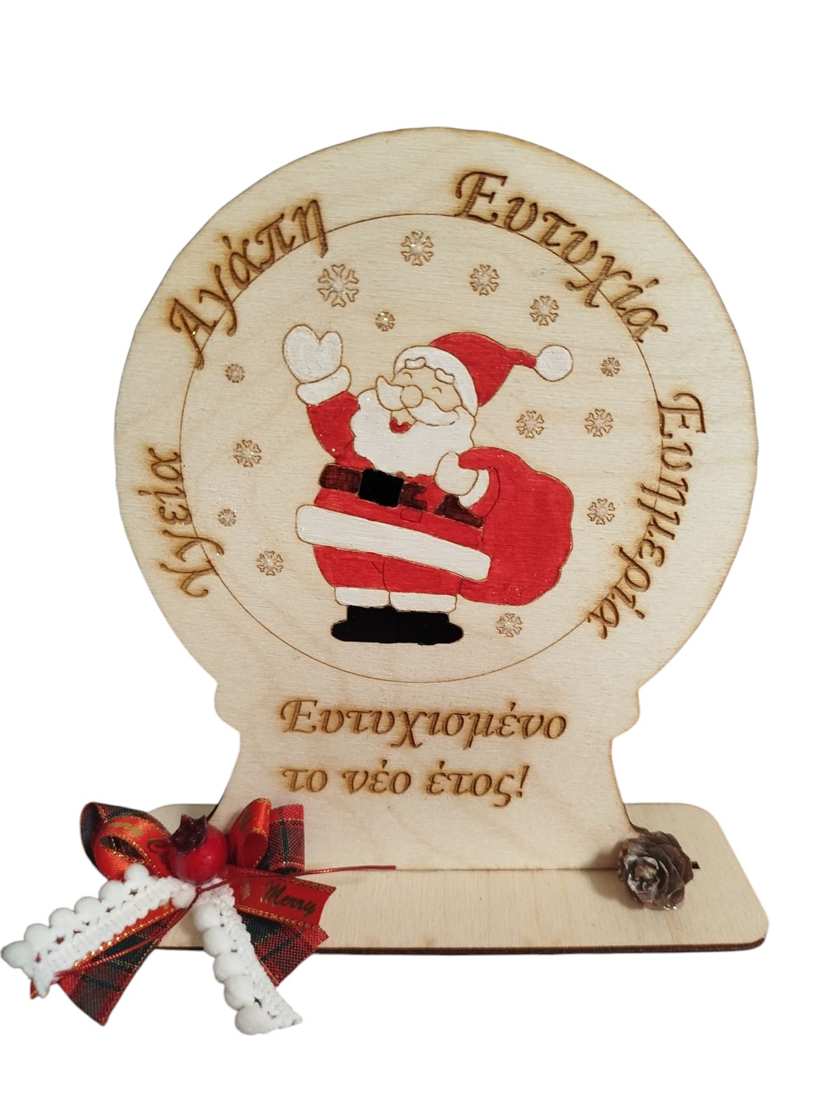 Χριστουγεννιάτικο ξύλινο διακοσμητικό χειροποίητα βαμμένο και διακοσμημένο με κορδέλες, κόκκινο ρόδι και κουκουνάρια.