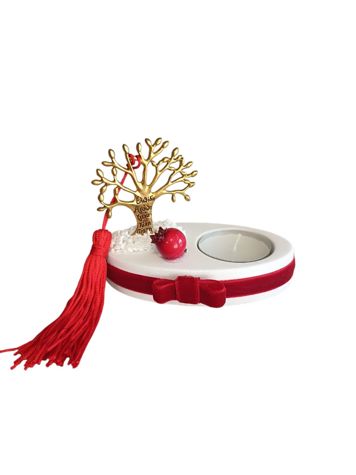 Χειροποίητο διακοσμητικό μεταλλικό δέντρο της ζωής, τοποθετημένο σε κομψή βάση με ρεσώ που χαρίζει φως και γιορτινή ατμόσφαιρα. Στολίζεται με φούντα, κορδέλα και ρόδι σε κόκκινες αποχρώσεις.