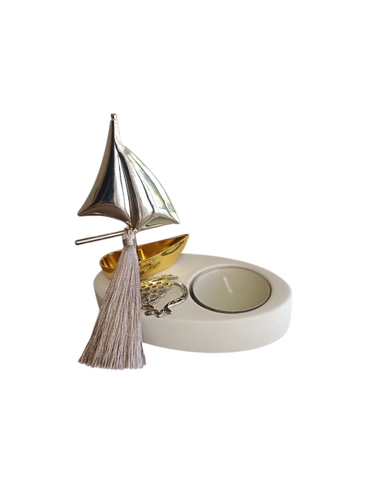 Χειροποίητο διακοσμητικό μεταλλικό καραβάκι, τοποθετημένο σε κομψή βάση με ρεσώ που χαρίζει φως και γιορτινή ατμόσφαιρα. Στολίζεται με ασημί μεταλλικό στοιχείο ροδιού.