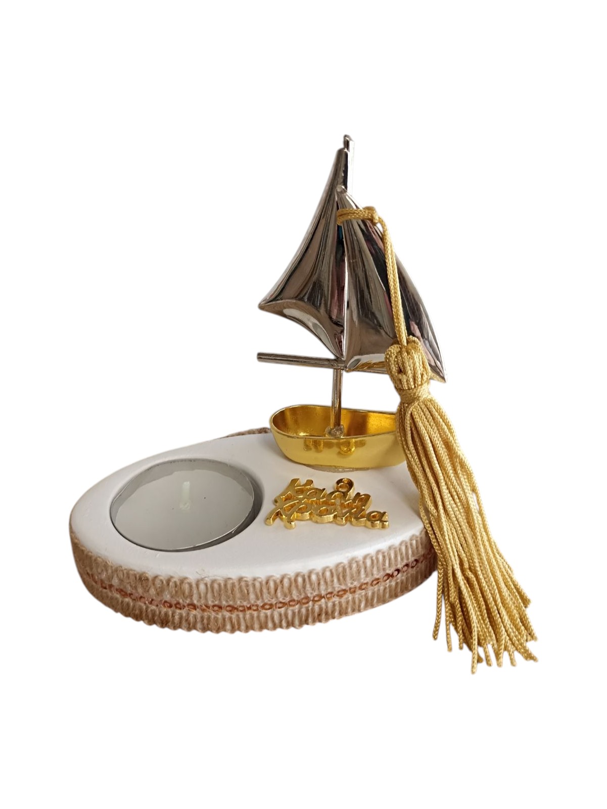 Χειροποίητο διακοσμητικό μεταλλικό καραβάκι, τοποθετημένο σε κομψή βάση με ρεσώ που χαρίζει φως και γιορτινή ατμόσφαιρα. Στολίζεται με μεταλλικό στοιχείο "Καλή χρονιά", σύμβολο αισιοδοξίας και νέων ξεκινημάτων.