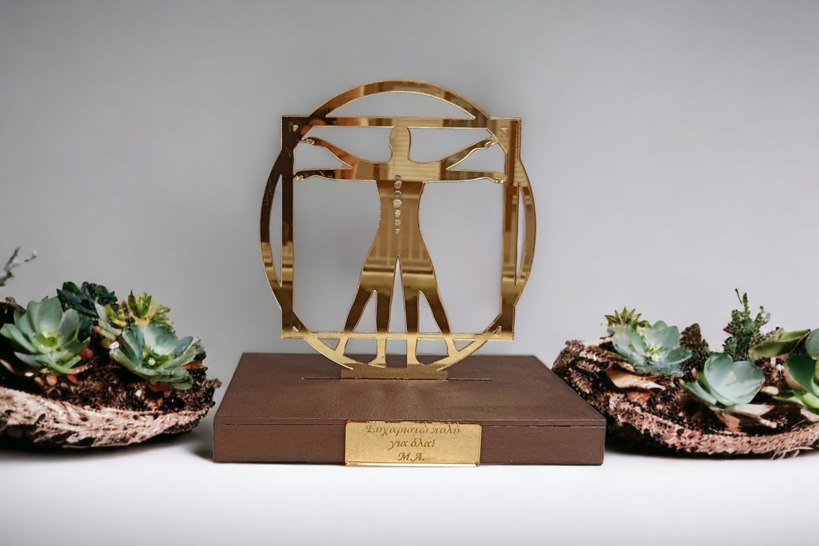 Eπιτραπέζιο διακοσμητικό σταντ - σύμβολο της φυσικοθεραπείας με χρυσό plexiglass καθρέπτη σε ξύλινη βάση.