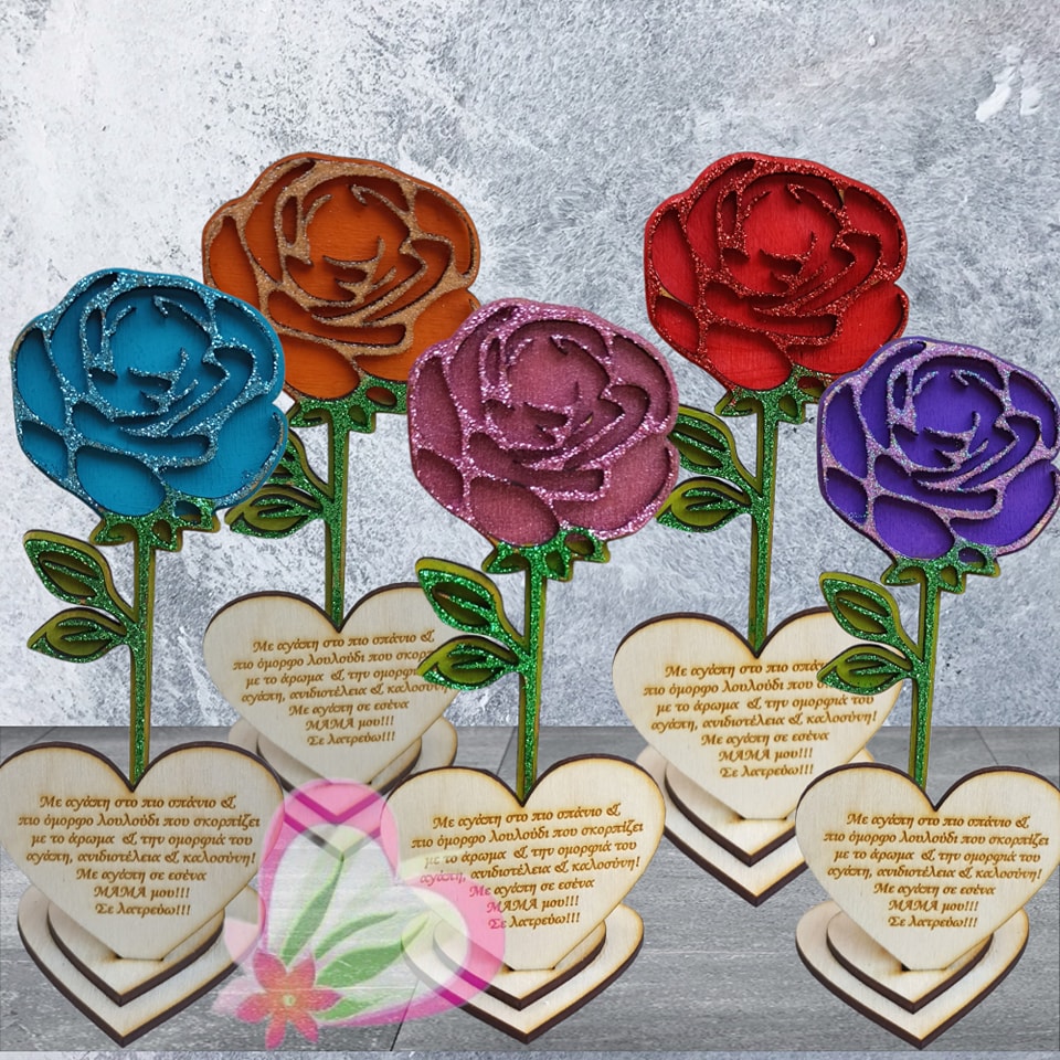 Τριαντάφυλλο ξύλινο σταντ 15εκ με αφιέρωση χειροποίητα βαμμένο και διακοσμημένο με glitter.