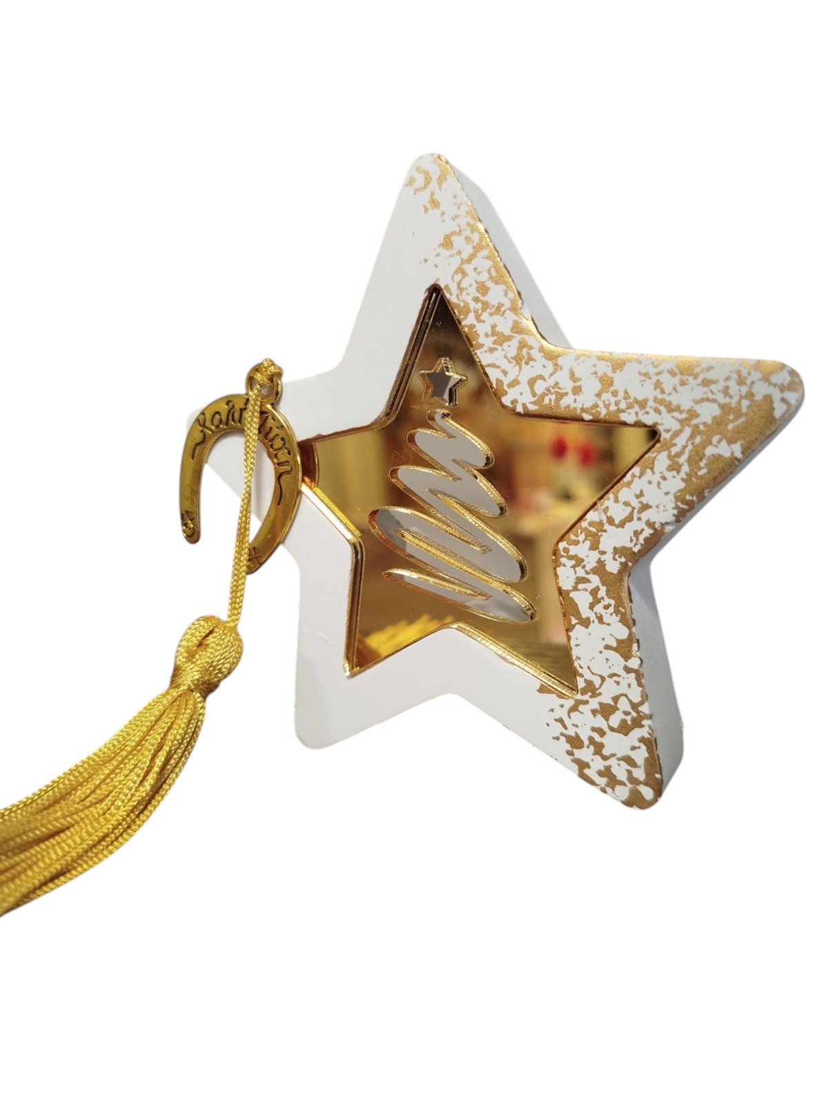 Κομψό επιτραπέζιο διακοσμητικό γούρι σε μορφή αστεριού, με λευκές και χρυσές λεπτομέρειες που προσδίδουν διαχρονική αισθητική και αίσθηση πολυτελείας. Διακοσμείται εξίσου με χρυσή φούντα και μεταλλικό στοιχείο "πέταλο" με χαραγμένη τη φράση "Καλή τύχη".