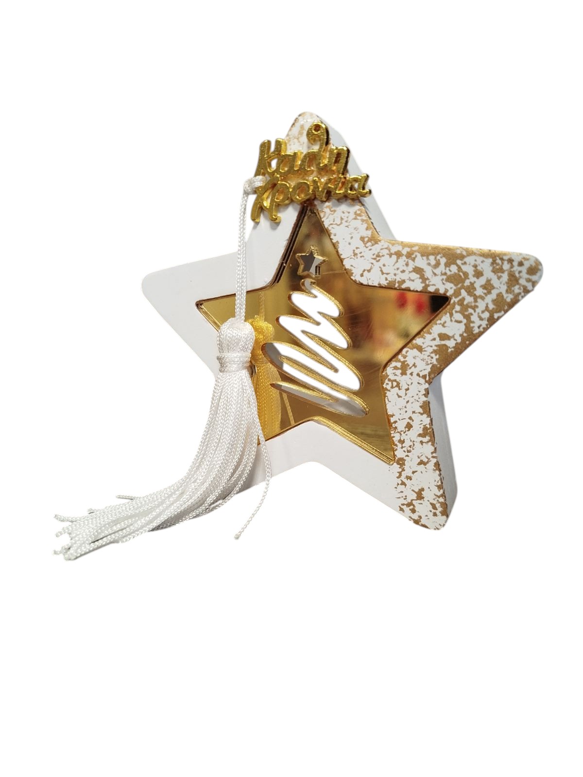 Κομψό επιτραπέζιο διακοσμητικό γούρι σε μορφή αστεριού, με λευκές και χρυσές λεπτομέρειες που προσδίδουν διαχρονική αισθητική και αίσθηση πολυτελείας. Διακοσμείται εξίσου με λευκή φούντα και μεταλλικό στοιχείο "Καλή χρονιά".