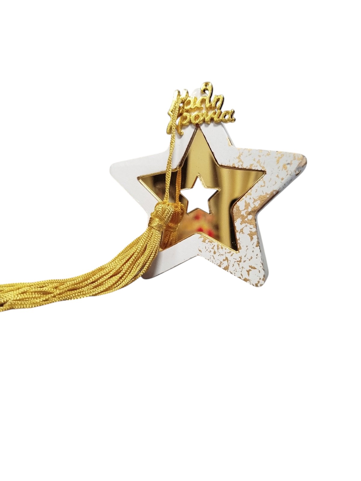Κομψό επιτραπέζιο διακοσμητικό γούρι σε μορφή αστεριού, με λευκές και χρυσές λεπτομέρειες που προσδίδουν διαχρονική αισθητική και αίσθηση πολυτελείας. Διακοσμείται εξίσου με χρυσή φούντα και μεταλλικό στοιχείο "Καλή χρονιά".