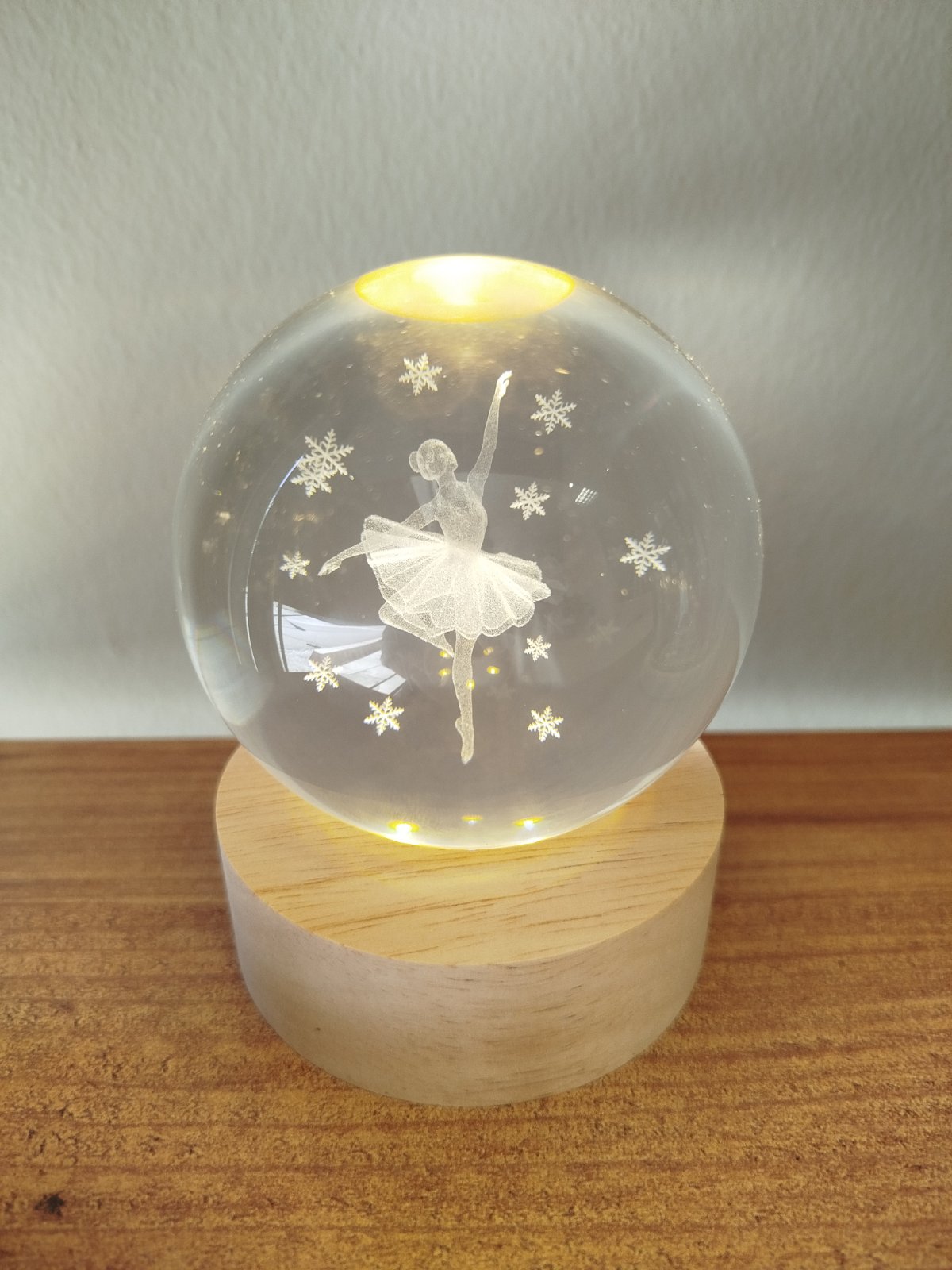 Η γυάλινη σφαίρα με χάραξη μπαλαρίνας και νιφάδων χιονιού, φωτίζεται απαλά φως, αναδεικνύοντας κάθε λεπτομέρεια. Τοποθετημένη πάνω σε ξύλινη βάση, συνδυάζει την κομψότητα με τη φυσικότητα του ξύλου.