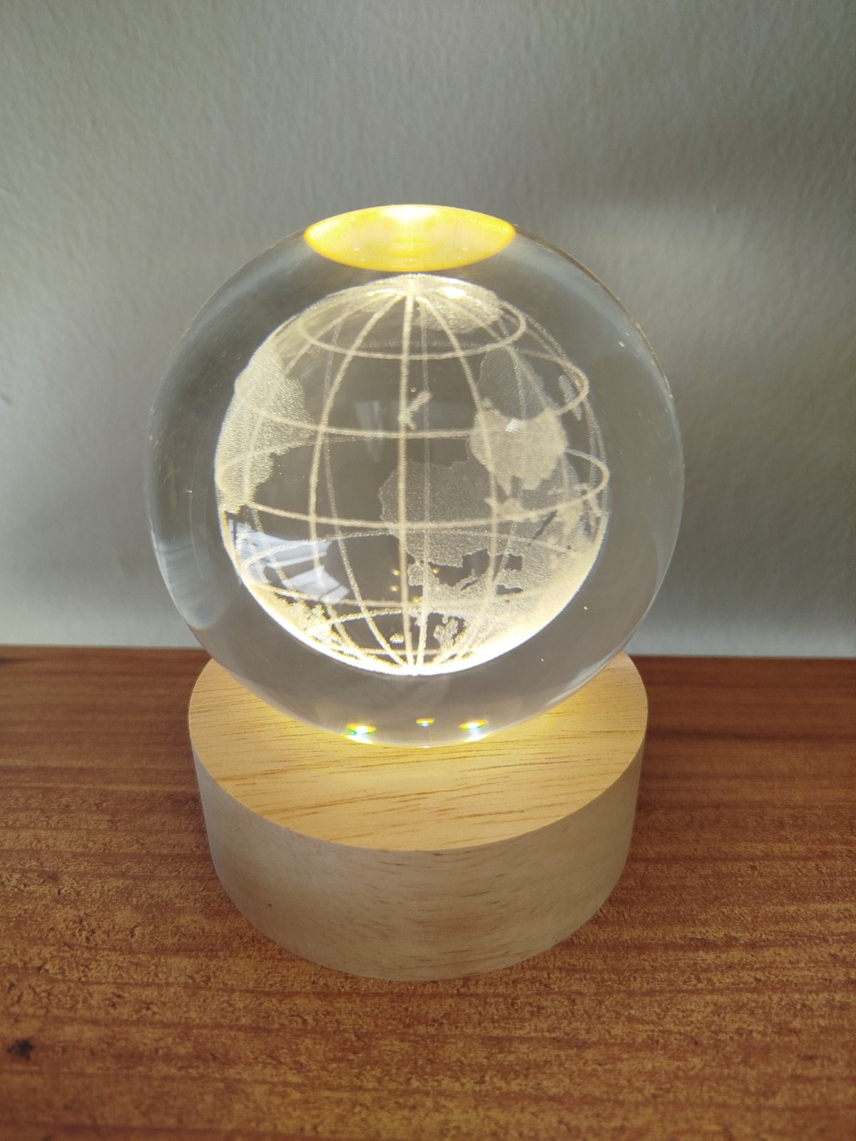 Η γυάλινη σφαίρα διαθέτει λεπτομερή χάραξη της υδρογείου, που φωτίζεται εντυπωσιακά με φως, δημιουργώντας μια ατμόσφαιρα ηρεμίας και έμπνευσης.
