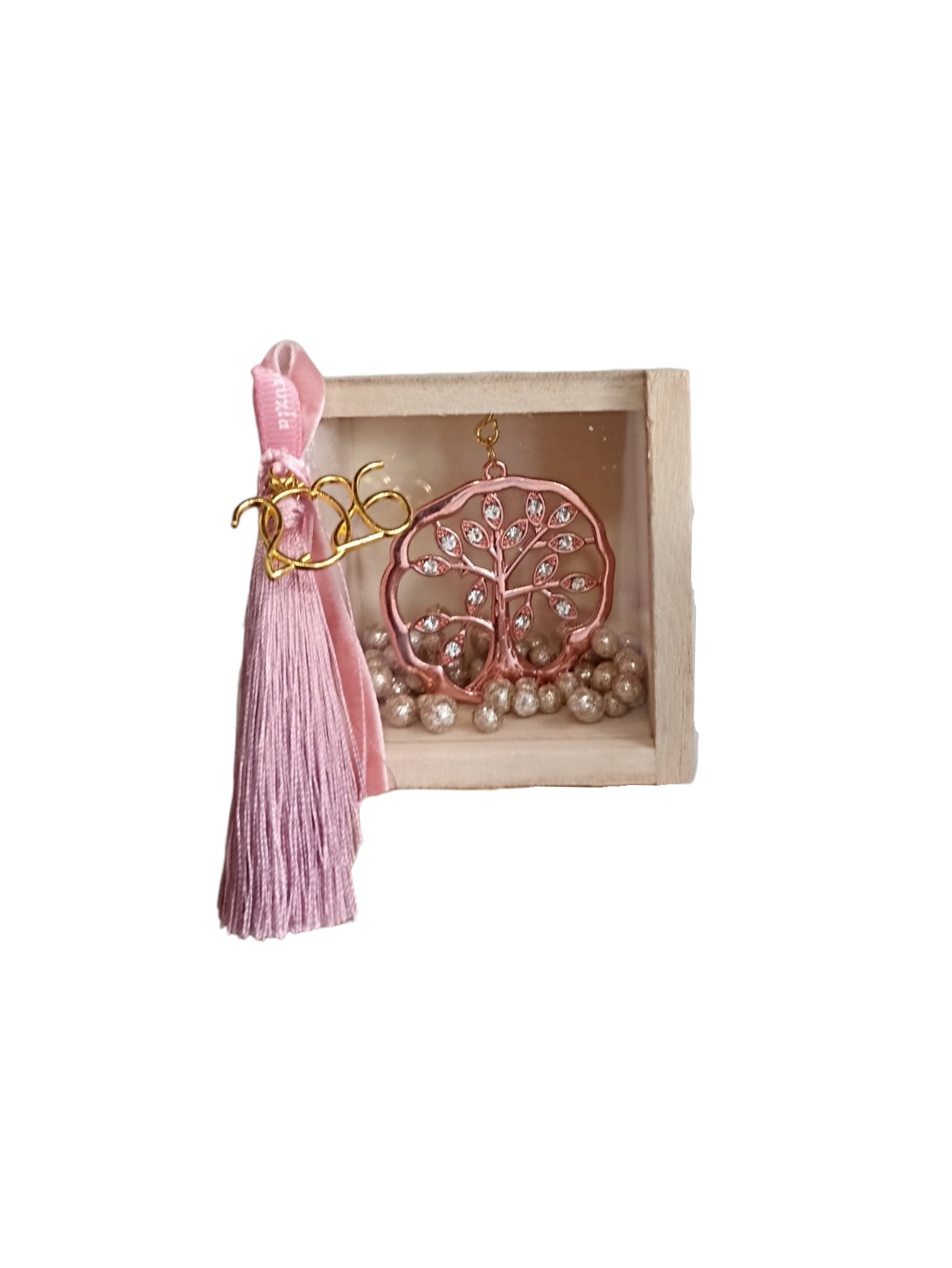Επιτραπέζιο ξύλινο γούρι, χειροποίητα διακοσμημένο με ροζ φούντα, ροζ κορδέλες και το έτος. Στο εσωτερικό κρέμεται χρυσό μεταλλικό στοιχείο "Δέντρο της ζωής με ευχές" σε σαπιο μήλο χρώμα.