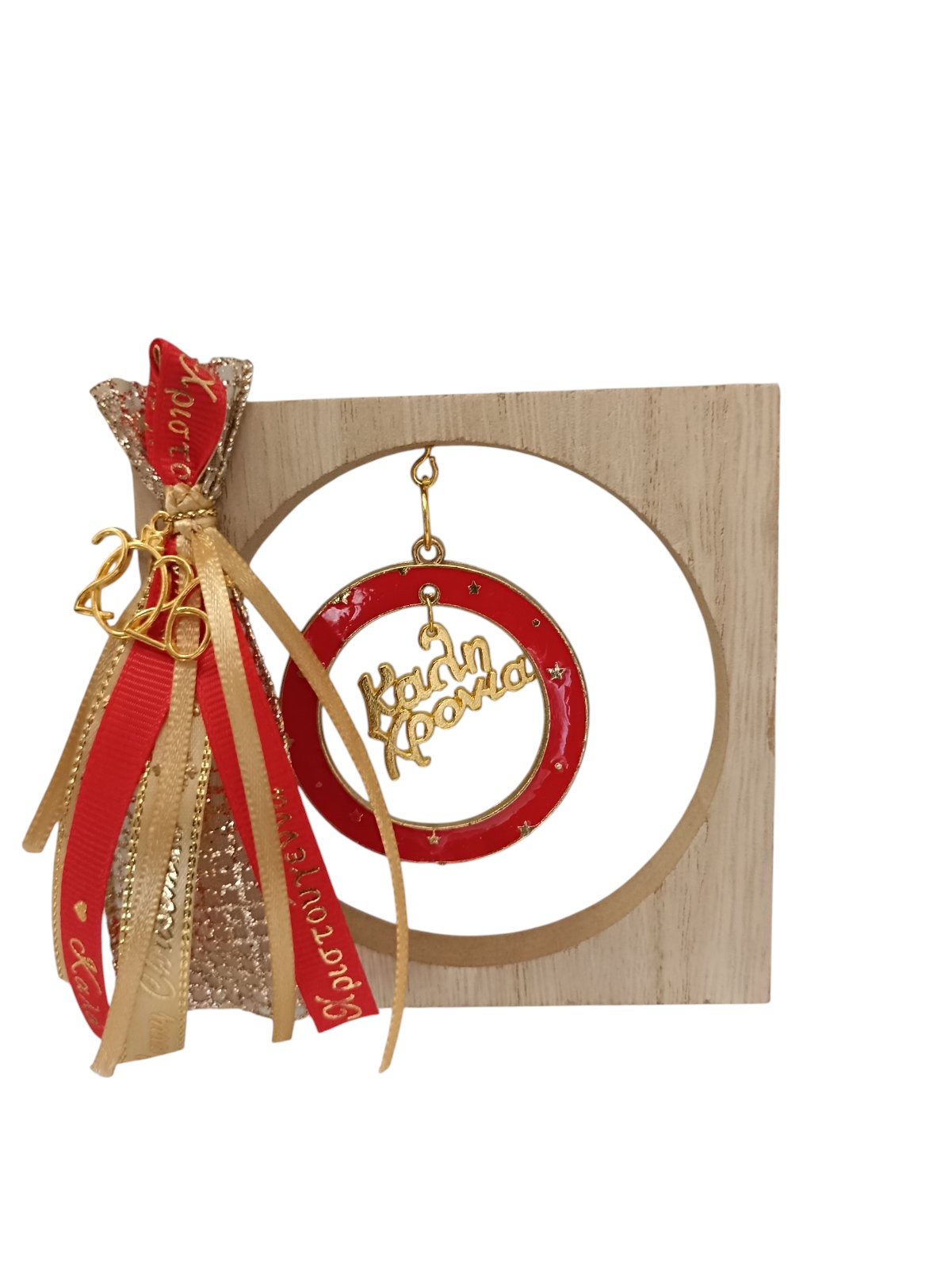 Κομψό επιτραπέζιο γούρι, διακοσμημένο με χρυσές και κόκκινες κορδέλες που αποπνέουν γιορτινή λάμψη και θετική ενέργεια. Στο εσωτερικό του κρέμεται μεταλλικό στοιχείο "Καλή χρονιά", σύμβολο ελπίδας, τύχης και νέων ξεκινημάτων
