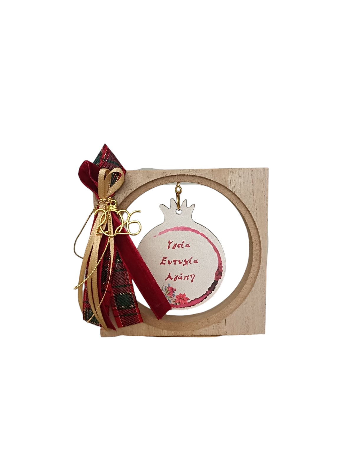 Χειροποίητο επιτραπέζιο ξύλινο γούρι, διακοσμημένο με κόκκινη βελούδινη κορδέλα για γιορτινή και κομψή εμφάνιση. Στο εσωτερικό του κρέμεται ξύλινο ρόδι με ευχές, σύμβολο τύχης και θετικής ενέργειας για το νέο έτος.