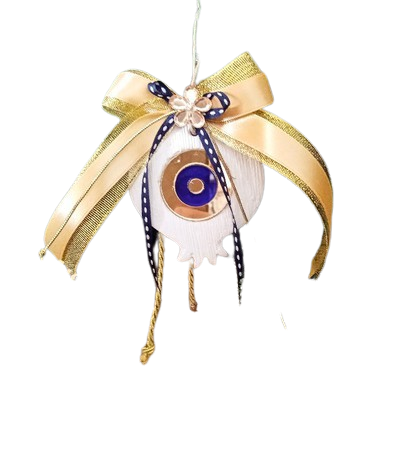 Κεραμικό λευκό ρόδι με μάτι με μπλε και χρυσό plexiglass διακοσμημένο με κορδέλες σε χρυσές και μπλε αποχρώσεις.