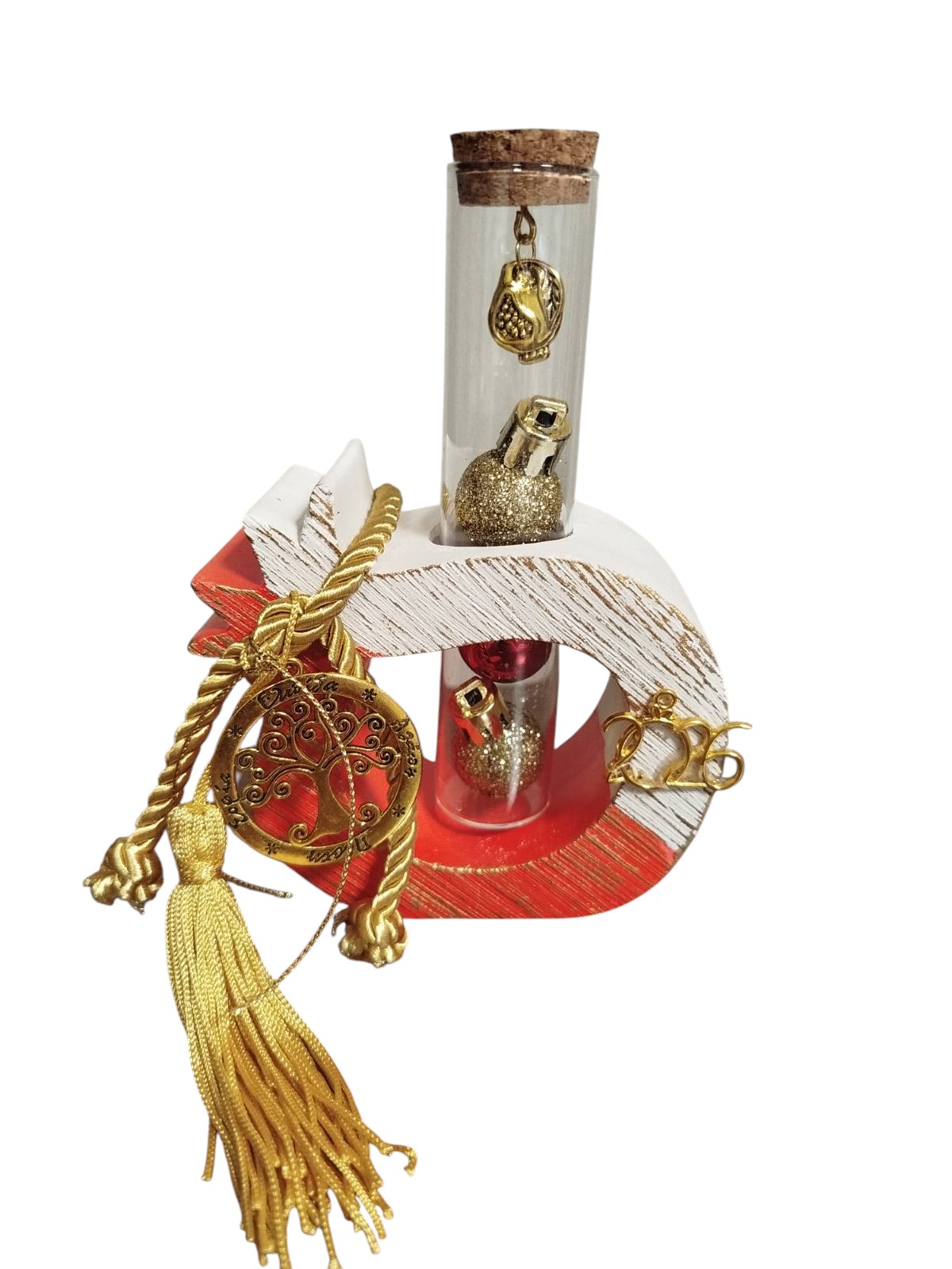 Κεραμικό χειροποίητο ρόδι με γυάλινο σωλήνα ο οποίος εσωτερικά διακοσμείται με μίνι μπάλες σε κόκκινο και χρυσό χρώμα κι ένα μεταλλικό χρυσό μίνι ρόδι. Διακοσμείται εξίσου με κορδόνι και φούντα σε χρώμα χρυσό και μεταλλικό χρυσό στοιχείο που απεικονίζει το δέντρο της ζωής.