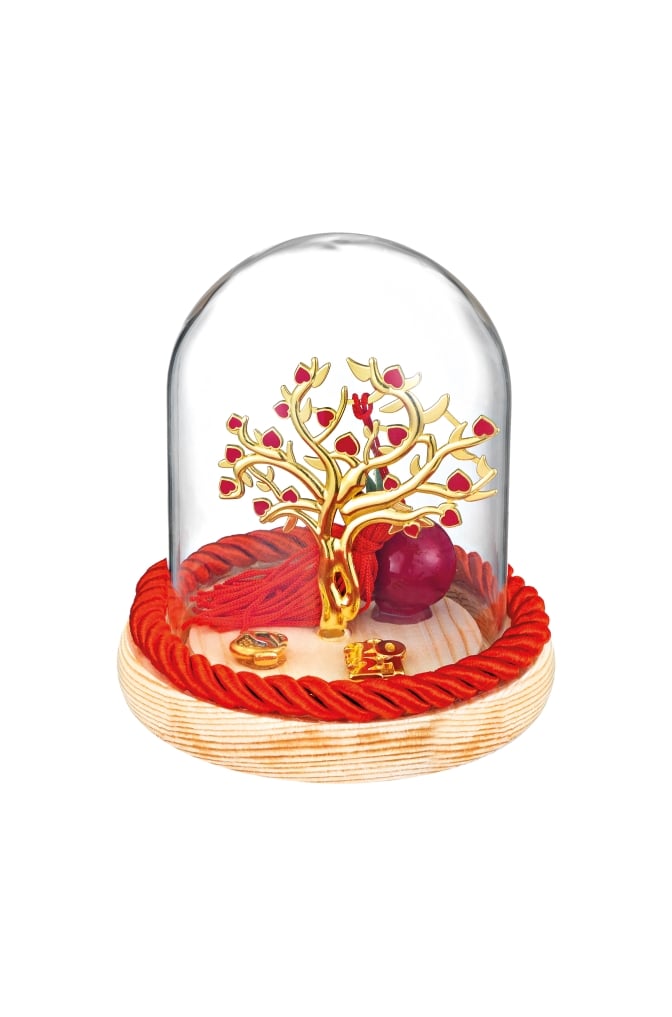 Γυάλινη καμπάνα με ξύλινη βάση η οποία εσωτερικά διακοσμείται από μεταλλικό χρυσό δεντράκι με κόκκινες καρδούλες. Στην βάση του διακοσμητικού υπάρχει μεταλλικό χρυσό ρόδι, μεταλλικό στοιχείο με τη χρονολογία και ένα μικεό κόκκινο ρόδι. Από το δεντράκι κρέμεται μία κόκκινη φούντα.