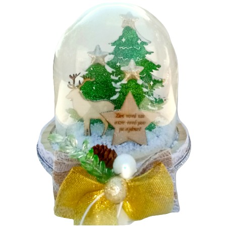 Γυάλινη καμπάνα διακοσμημένη εσωτερικά με τρία ξύλινα έλατα και ξύλινο ελαφάκι.