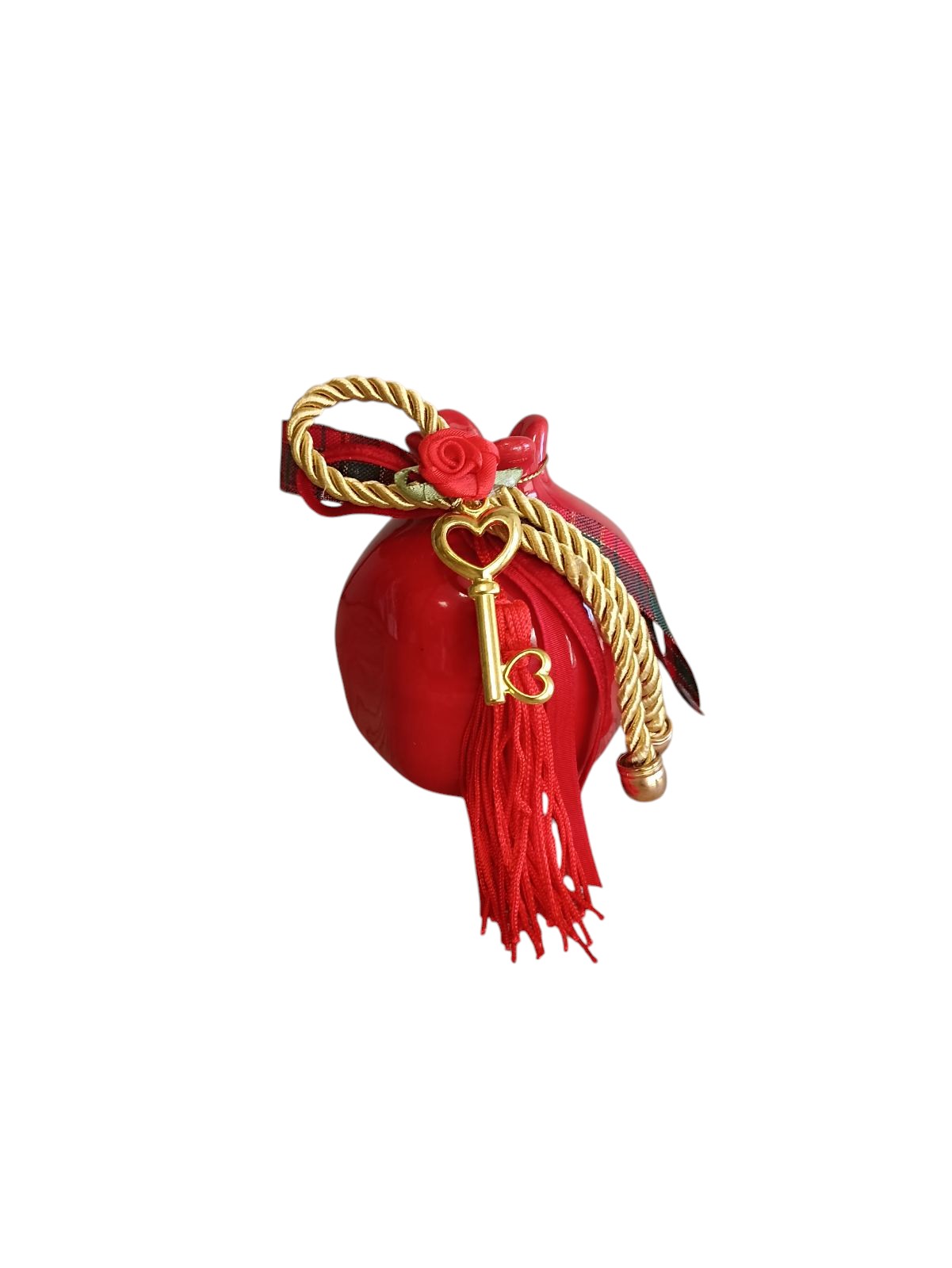 Κομψό κεραμικό ρόδι σε κόκκινο χρώμα, χειροποίητα διακοσμημένο με κορδέλες και μεταλλικό στοιχείο σε σχήμα κλειδιού.
