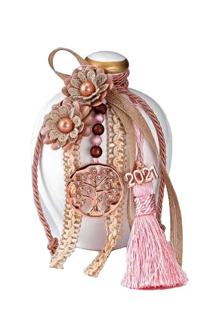 Κεραμικός κουμπαράς σε λευκό χρώμα διακοσμημένος με κορδέλες, κορδόνια και φούντα σε αποχρώσεις του καφέ, σάπιου μήλου και ροζ. Ιδιαίτερη έμφαση δίνει το μεταλλικό διακοσμητικο με το δέντρο της ζωής το οποίο τονίζουν με διακριτικό τρόπο τα στρας.