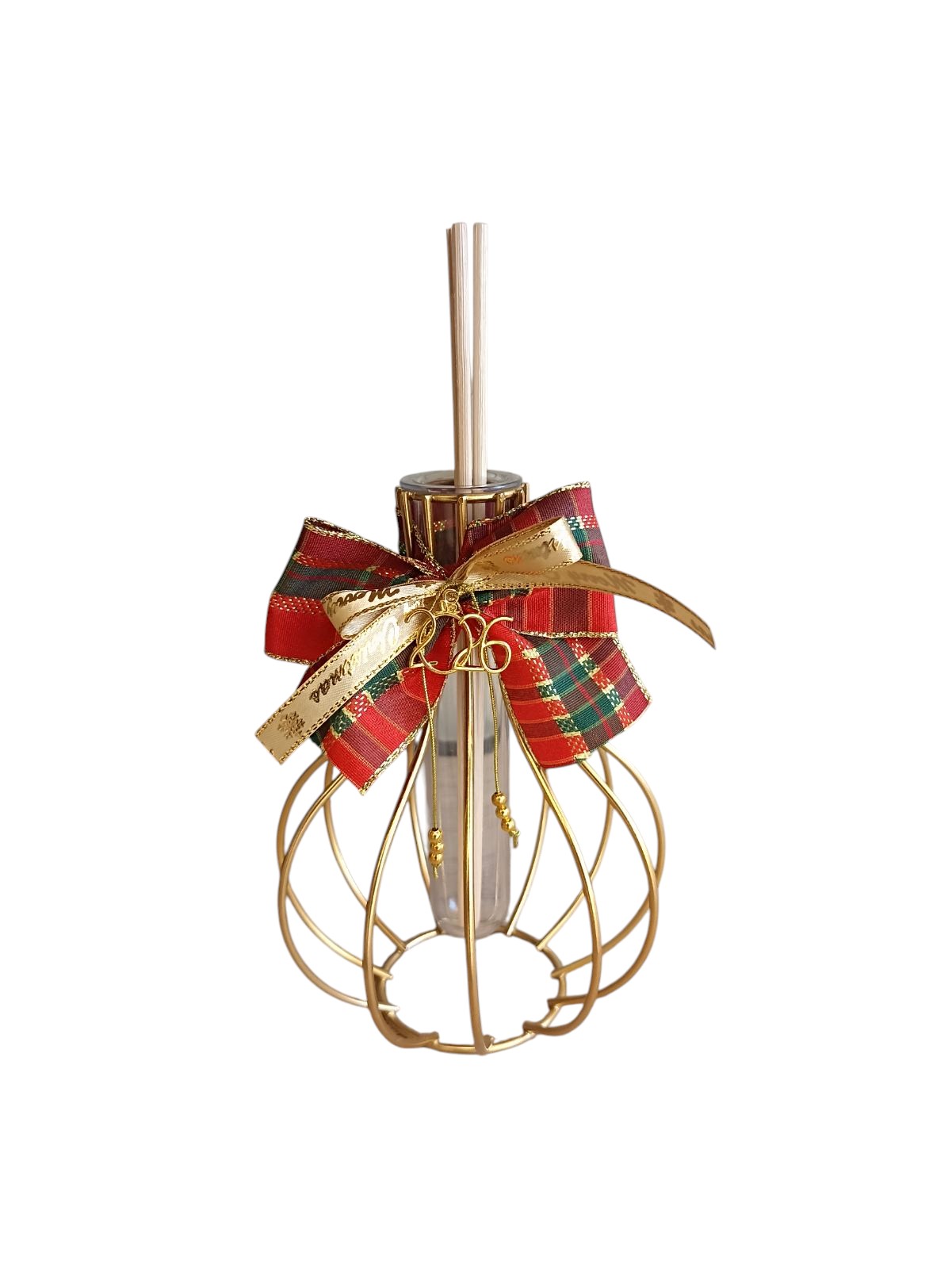 Ένα εκλεπτυσμένο αρωματικό χώρου που συνδιάζει διαχρονική κομψότητα και γιορτινή πολυτέλεια. Το γυάλινο δοχείο είναι μέσα σε ιδιαίτερη χρυσή μεταλλική βάση και στολίζεται χειροποίητα με εντυπωσιακές κορδέλες υψηλής αισθητικής και μεταλλικό στοιχείο με το έτος, δημιουργώντας ένα μοναδικό διακοσμητικό για τον χώρο.