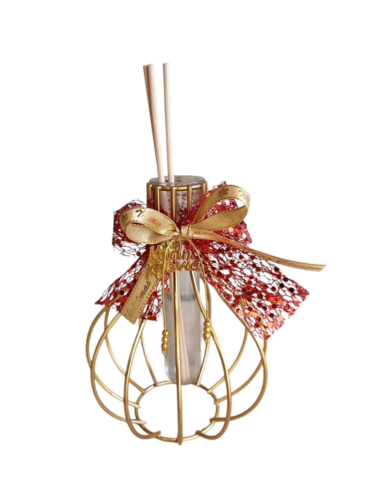 Ένα εκλεπτυσμένο αρωματικό χώρου που συνδυάζει διαχρονική κομψότητα και γιορτινή πολυτέλεια. Το γυάλινο δοχείο είναι σε ιδιαίτερη χρυσή μεταλλική βάση, στολίζεται χειροποίητα με εντυπωσιακές κορδέλες υψηλής αισθητικής και μεταλλικό στοιχείο Καλή χρονιά, δημιουργώντας ένα μοναδικό διακοσμητικό για το χώρο.