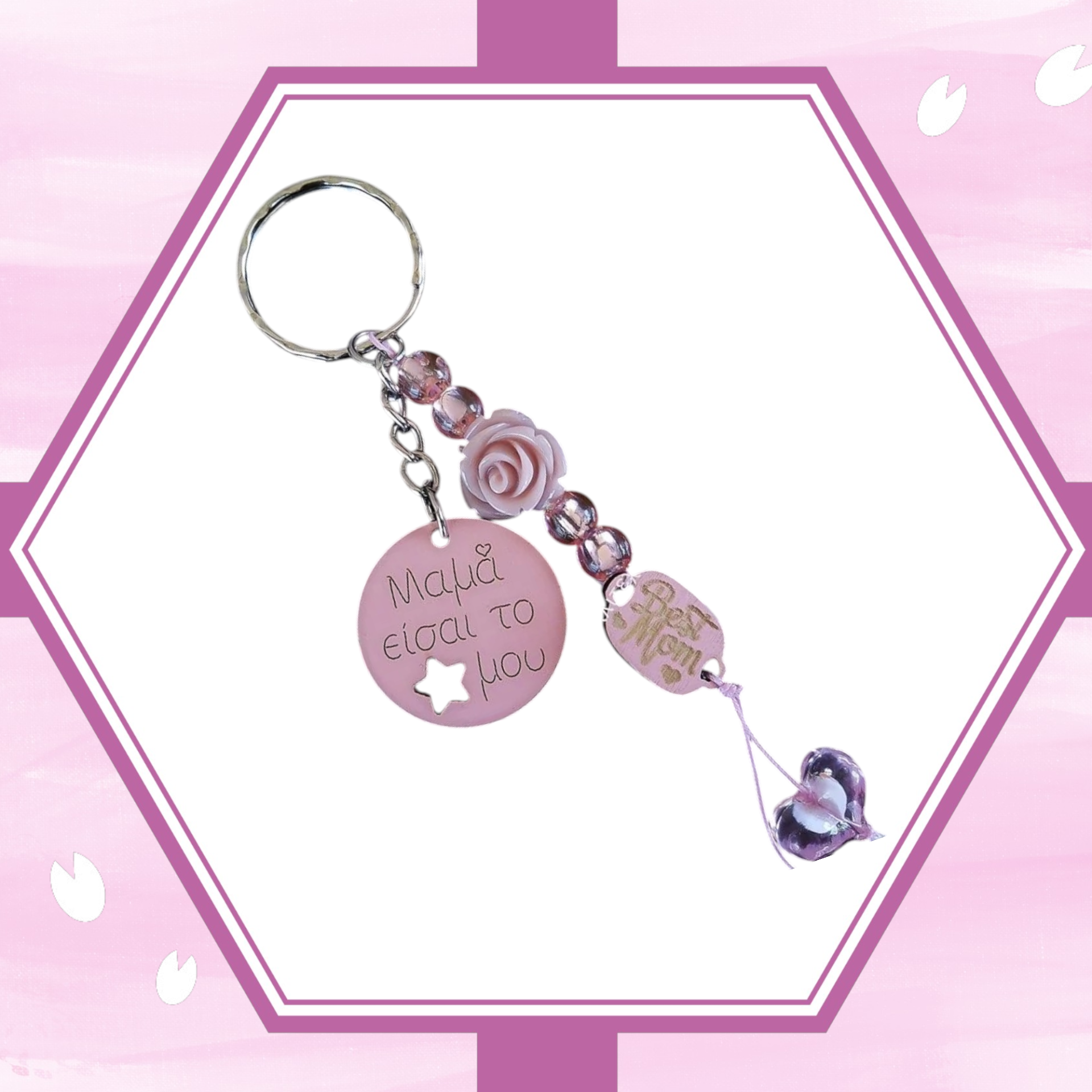 Ξύλινο μπρελόκ 5εκ με αφιέρωση "Μαμά είσαι το αστέρι μου" σε ροζ χρώμα διακοσμημένο με χάντρες και τριανταφυλλάκι.