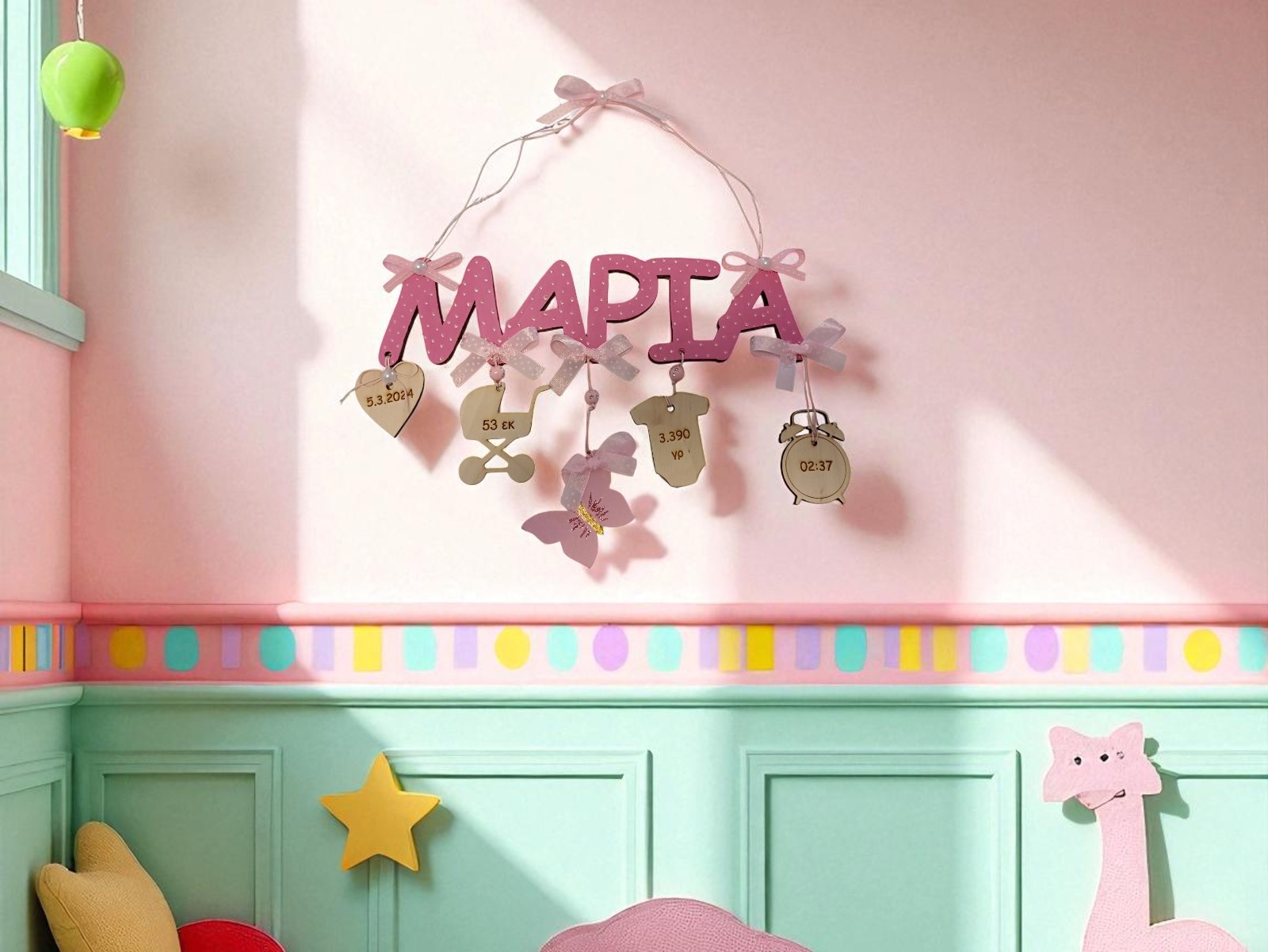 Χειροποίητο ξύλινο κρεμαστό διακοσμητικό με το όνομα του παιδιού. Ιδανικό για να κρατήσετε ζωντανές τις πιο όμορφες αναμνήσεις της γέννησής του. Κάτω από το όνομα κρέμονται στοιχεία που αποτυπώνουν τη στιγμή της γέννησης: η ημερομηνία, η ώρα, το βάρος και το ύψος του μωρού.