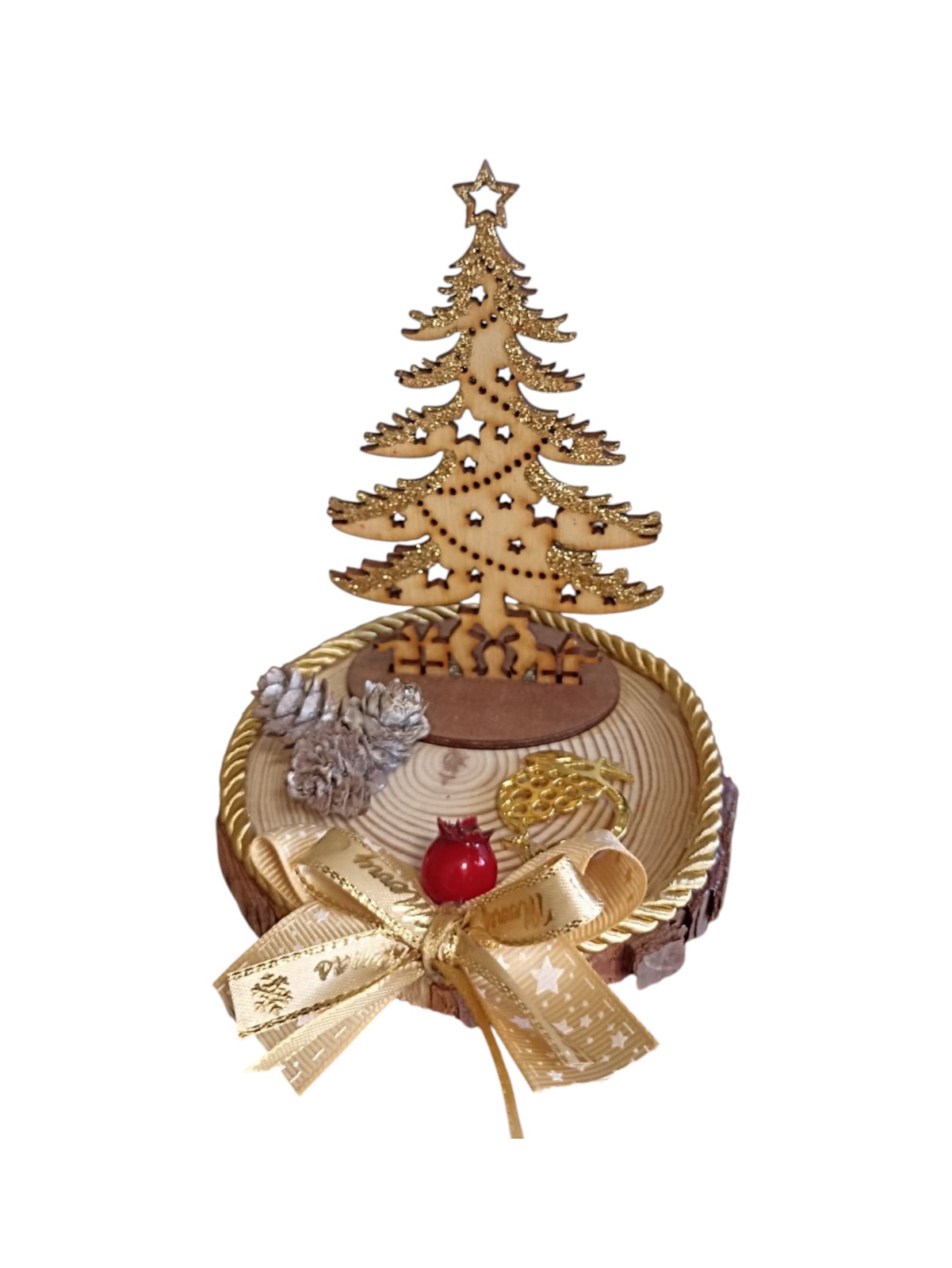 Χειροποίητο διακοσμητικό, με ξύλινο χριστουγεννιάτικο δεντράκι με glitter, ρόδι, κουκουνάρια και μεταλλικό στοιχείο ροδιού, τοποθετημένα πάνω σε κορμό ξύλου.