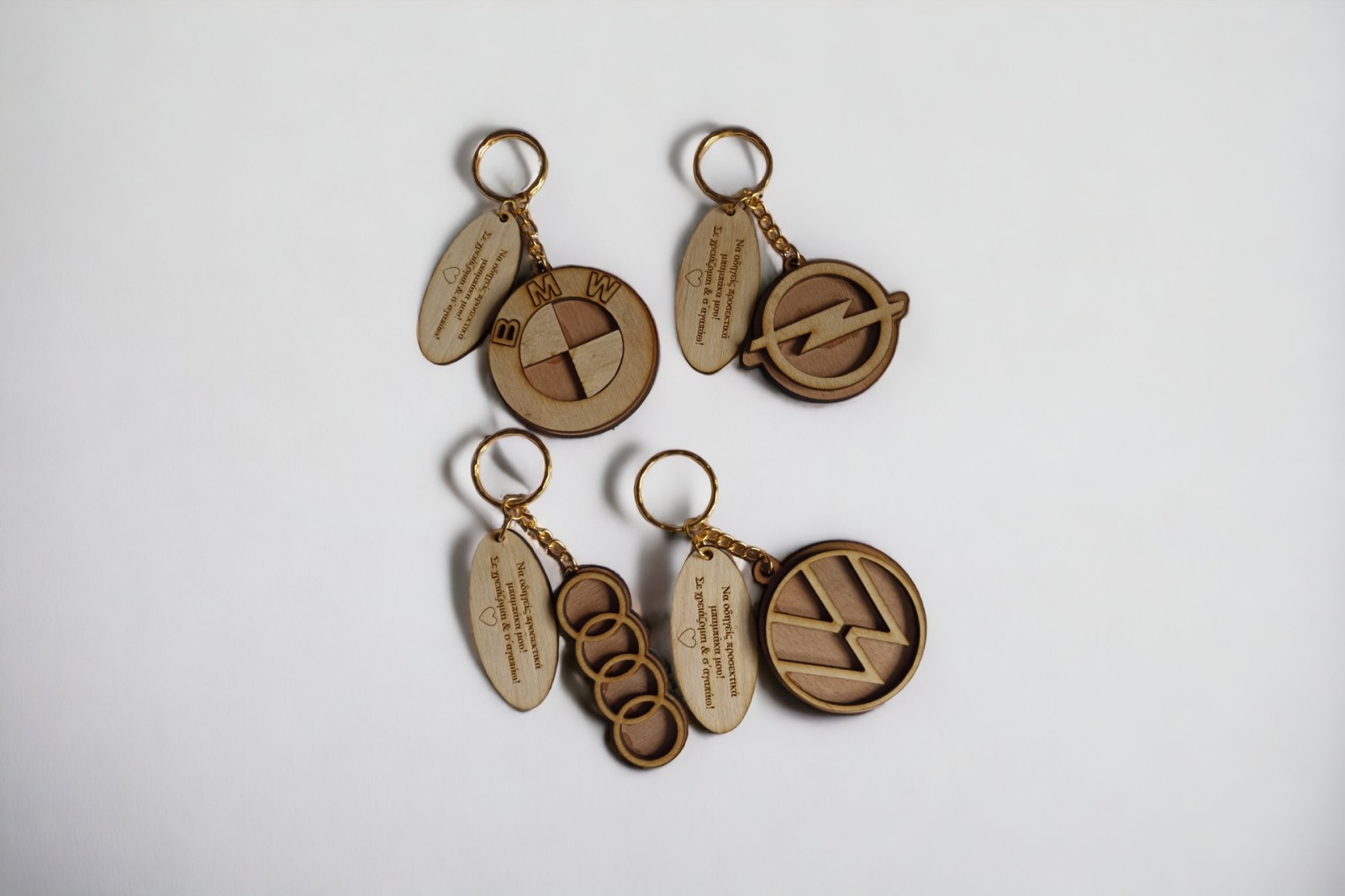 Ξύλινο μπρελόκ με την μάρκα του αυτοκινήτου και την αφιέρωση της επιλογής σας
