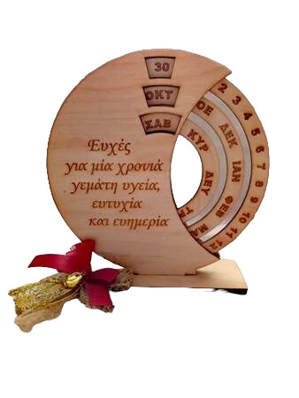 Ξύλινο περιστρεφόμενο ημερολόγιο με χαραγμένες ευχές, διακοσμημένο με κορδέλες και μεταλλικό χρυσό ρόδι.