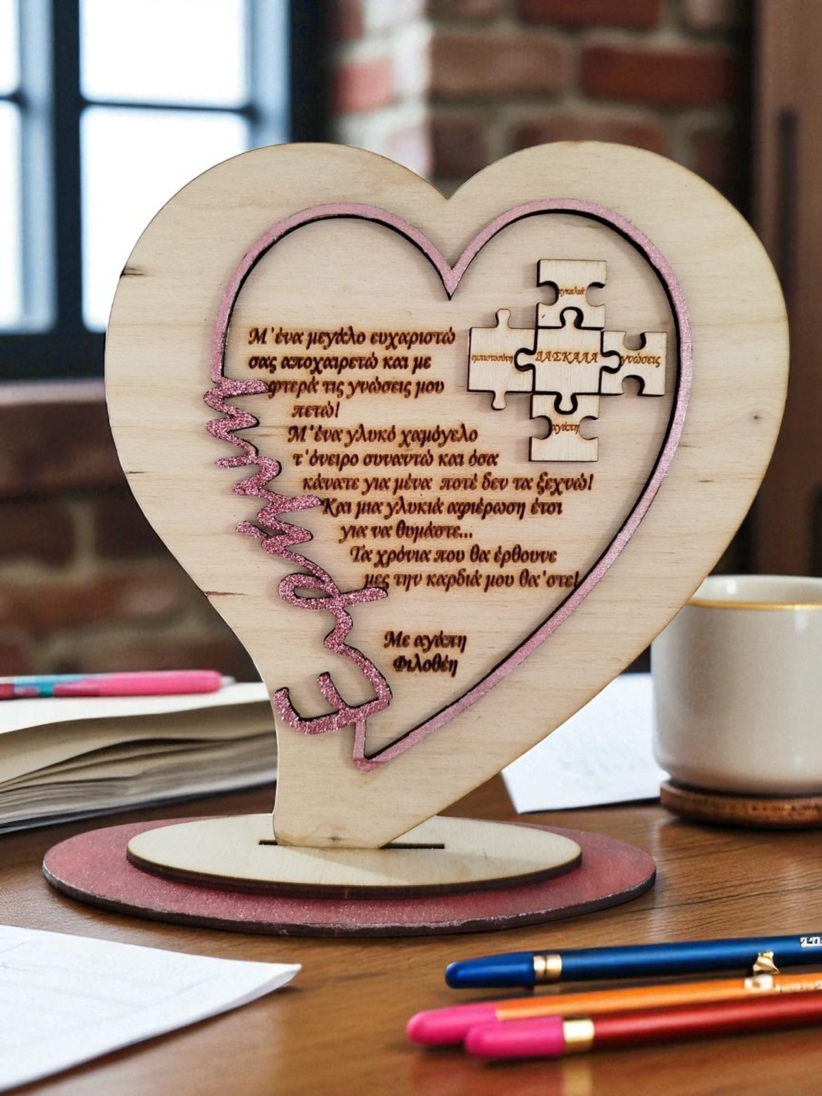 Ένα ξεχωριστό ξύλινο σταντ 18εκ σε σχήμα καρδιάς με ροζ λεπτομέρειες και χαραγμένο μήνυμα, ιδανικό δώρο για τη δασκάλα. Περιλαμβάνει το όνομα του παιδιού και μπορεί να γίνει με την αφιέρωση της επιλογής σας.