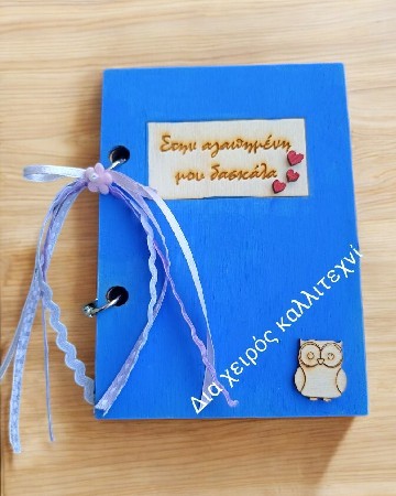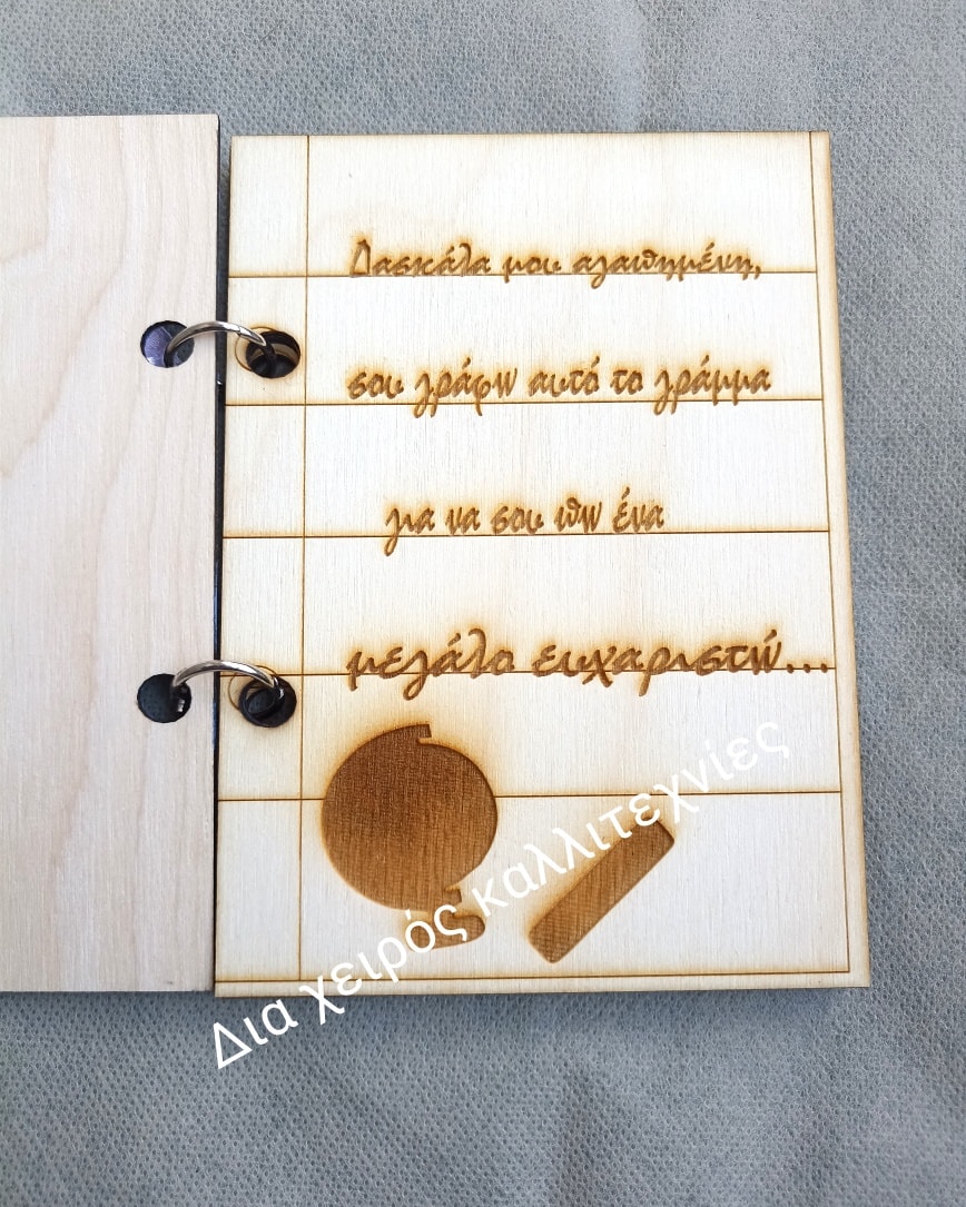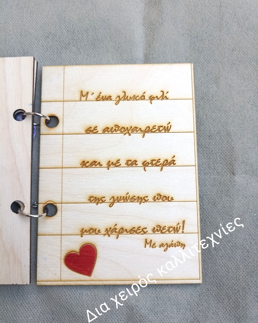 Ξύλινο και χειροποίητο τετράδιο 15εκ με χαραγμένη αφιέρωση. Περιλαμβάνει 3 ξύλινες σελίδες.